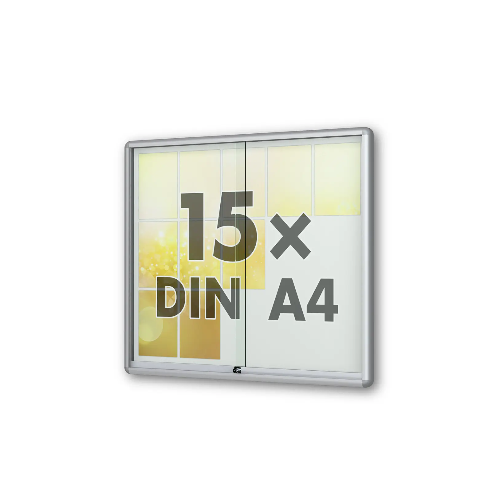 Schaukasten Fortis - eckig - mit Schiebetüren - 60 mm Gehäusetiefe, rollengelagerte Schiebetüren, höchster Brandschutz (A1) Größe - 15 × DIN A4 • 1150 × 1010 mm Öffnung - rollengelagerte SchiebetürenVerglasung - Einscheiben-Sicherheitsglas / ESGOberfläche - Eloxierung in matt-silber (E6/EV1)Beleuchtung - ohne BeleuchtungSchließung - Sicherheitsschlösser mit je 2 SchlüsselnRückwand - weiße, magnethaftende Rückwand inkl. 10 Magnete
