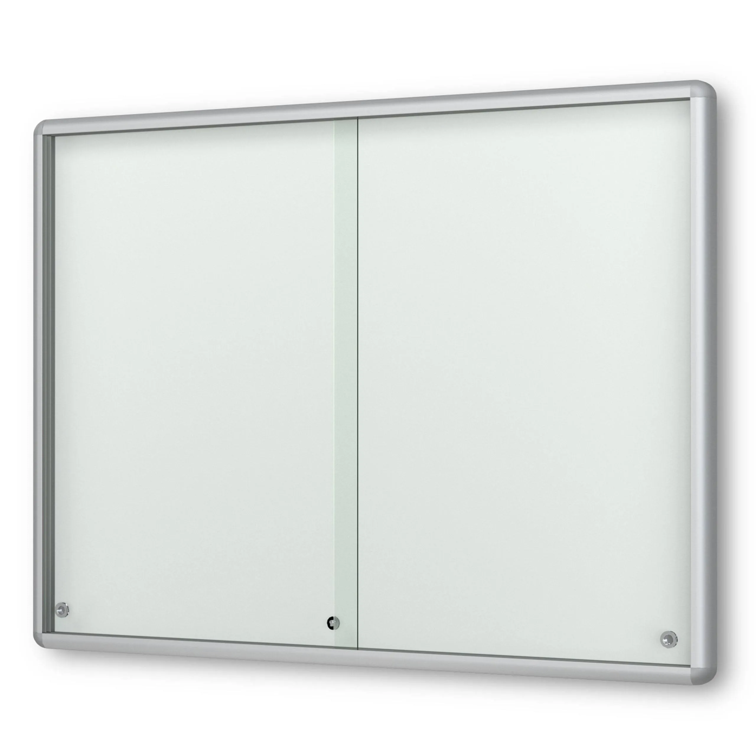 Schaukasten Fortis - eckig - mit Schiebetüren - 60 mm Gehäusetiefe, rollengelagerte Schiebetüren, höchster Brandschutz (A1) Größe - 24 × DIN A4 • 1810 × 1010 mm Öffnung - rollengelagerte SchiebetürenVerglasung - Einscheiben-Sicherheitsglas / ESGOberfläche - Eloxierung in matt-silber (E6/EV1)Beleuchtung - ohne BeleuchtungSchließung - Sicherheitsschlösser mit je 2 SchlüsselnRückwand - weiße, magnethaftende Rückwand inkl. 10 Magnete