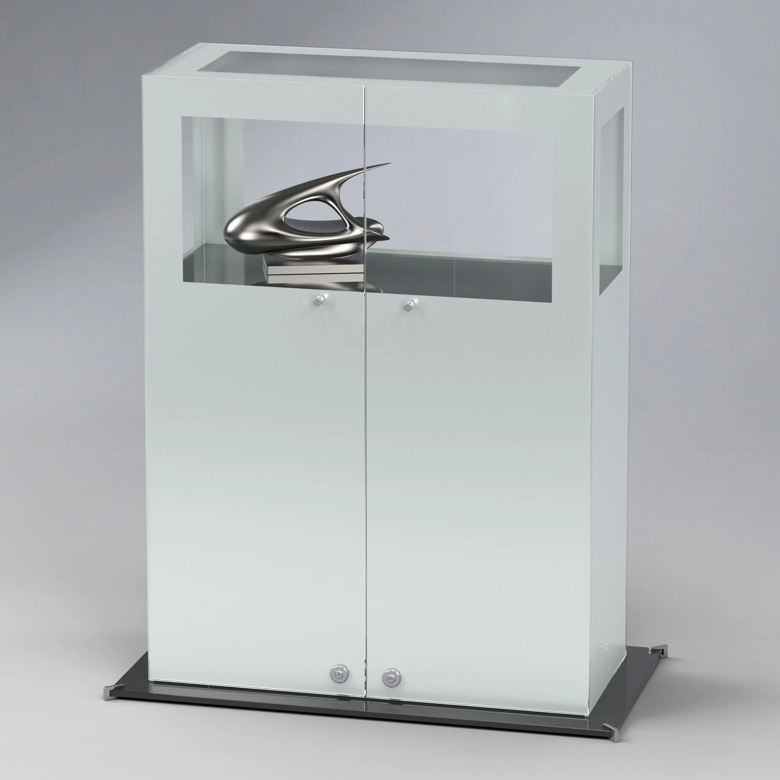 Tischvitrine Ganzglas mit Standbeinen -  Design-Vitrine für Museen, Ausstellungen oder das exklusive BüroRahmenlose Ganzglas-Konstruktion mit 8mm ESG-Sicherheitsglas Größen B/H/T1000 × 970 × 500 mm1200 × 970 × 500 mm1400 × 970 × 500 mmHöhe des Glaskorpus 220 mm Öffnung - Glaskorpus aufklappbar mit seitlichen Gasdrucköffnern,die den Aufbau arretierenVerglasung - Einscheiben-Sicherheitsglas / ESGOberfläche - RAL-9010, Reinweiß oder RAL-9005, Tiefschwarz - RAL-Classic Farbtöne nach WunschBeleuchtung - ohne Beleuchtung - optional: waagerechte Strahlerschiene mit LED-Strahlern, inkl. TrafoSchließung - Sicherheitsschloss mit 2 Schlüsseln