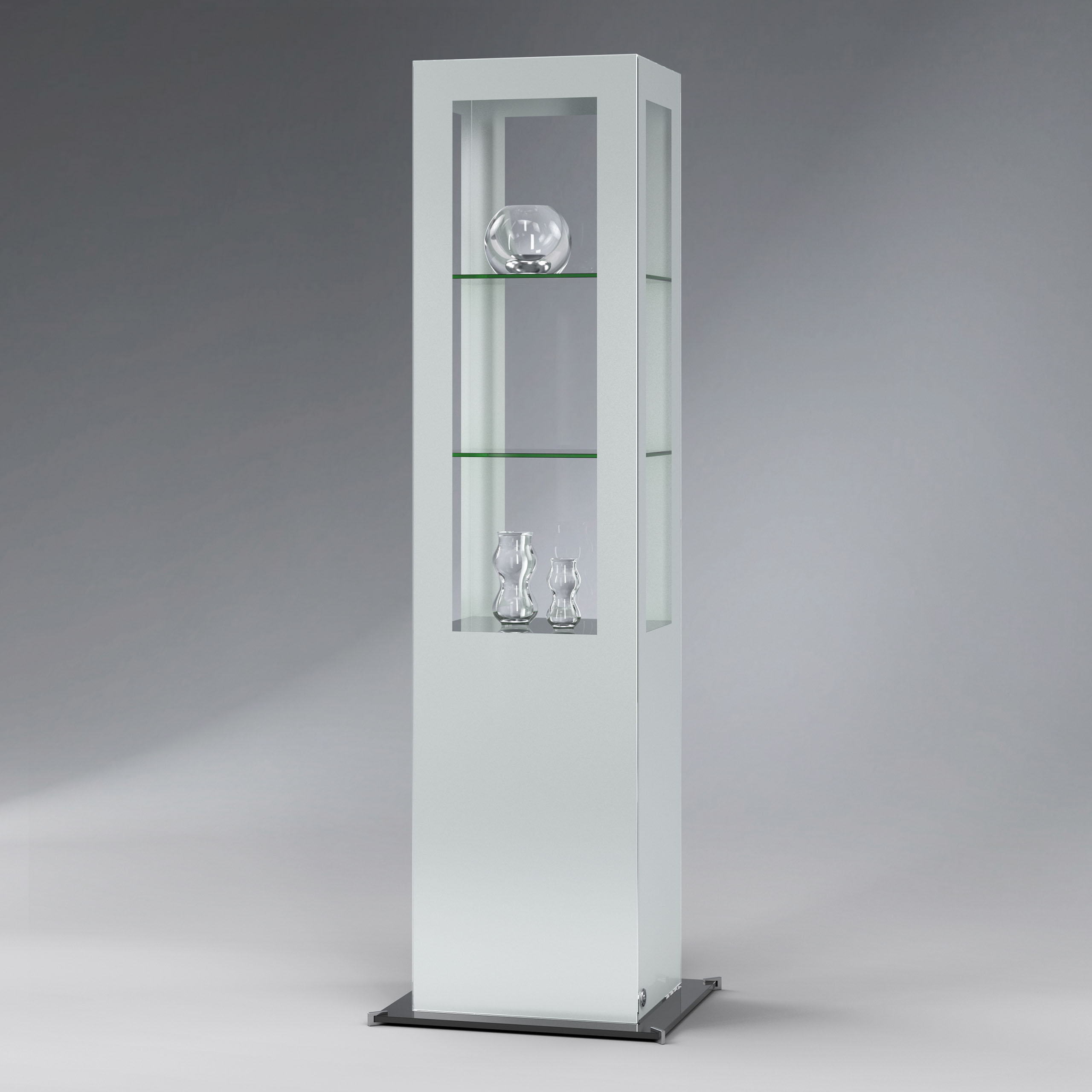 Säulenvitrine Ganzglas mit Deckel - Design-Vitrine für Museen, Ausstellungen oder das exklusive Büro Rahmenlose Ganzglas-Vitrine mit ESG-SicherheitsglasInkl. 3 Glasfachböden, an senkrechten Edelstahl-Stangen stufenlos höhenverstellbarOptionale Beleuchtung mit LED-Strahlern in der Vitrine Größen B/H/T500 × 1900 × 500 mm600 × 1900 × 600 mmSonderanfertigung auf Anfrage Oberfläche - Standard: Sockel/Deckel wahlweise in schwarz, weiß oder hellgrauOptional (gegen Aufpreis): Lackierung in RAL-Farbton nach WahlBeleuchtung - Ohne Beleuchtung – Beleuchtung mit 1 LED-Strahlern, in Deckenbereich integriert - Optional Set mit 4 oder 8 LED-Strahlern in Niedervolt-Technik, anschlussfertig inkl. Trafo an senkrechter Edelstahlstange3 Glasböden inklusive, stufenlos höhenverstellbar.Max. Belastbarkeit ca. 15 kg je Fachboden bei gleichmäßiger LastverteilungVerglasung - ESG-Sicherheitsglas bei allen außen liegenden GlasflächenÖffnung - Ganzglas-Drehtür mit Drehbändern, nach rechts öffnendSchließung - Sicherheitsschloss im unteren Bereich der Tür